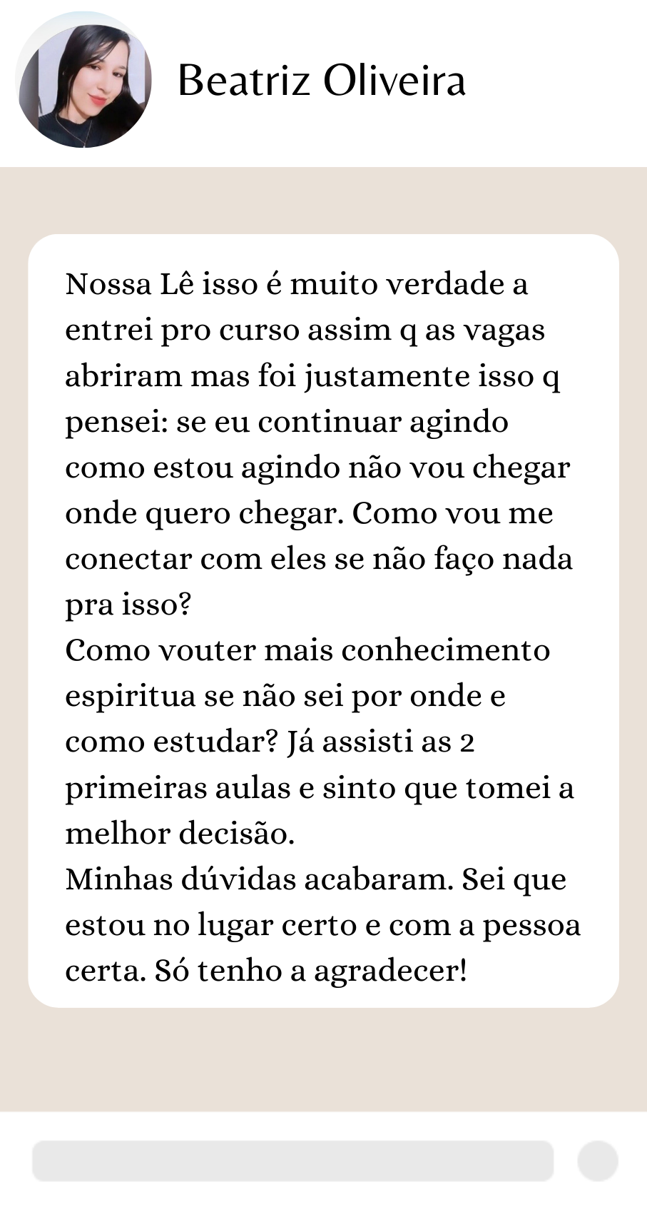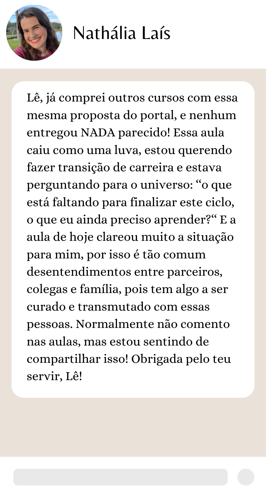 O que eu achei desse curso de verdade: ele mudou o meu jeito de pensar e de lidar com os meus problemas. Muito obg lê por esse curso eu de verdade amei muito mesmo , foi e está sendo transformador na minha vida . Você é uma luz na minha vida , uma luz para me ajudar a seguir o caminho certo, uma verdadeira mentora para mim aqui na terra.